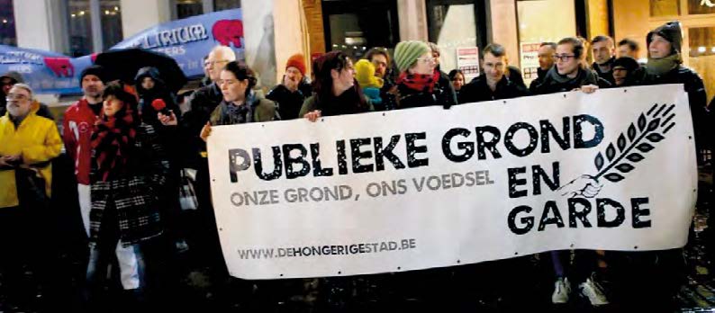 Le conseil communal de Gand, à l’époque à peine conscient des possibilités d’attribuer à ses terrains une valeur d’usage et une valeur politique en plus de leur valeur financière, prend peu à peu conscience du "fond du problème", mais réagit par un double signal contradictoire. D’une part, il déclare qu’il étudiera la manière dont les terres peuvent être utilisées dans le cadre de leur stratégie alimentaire, mais d’autre part, il annonce au début de la nouvelle législature (2019-2024) qu’il prévoit de lever à nouveau 40 millions d’euros en vendant des terres publiques. De Hongerige Stad prend à nouveau l’initiative et organise une manifestation à l’hôtel de ville le soir de l’approbation du budget. La manifestation reçoit l’attention des médias et le soutien d’organisations telles que le Boerenforum [mouvement de paysans en Flandre, NDLR], mais aussi d’un groupe de citoyens unis autour de la politique du logement à Gand, « Bernadette Blijft » (devenu plus tard le Volksraad).